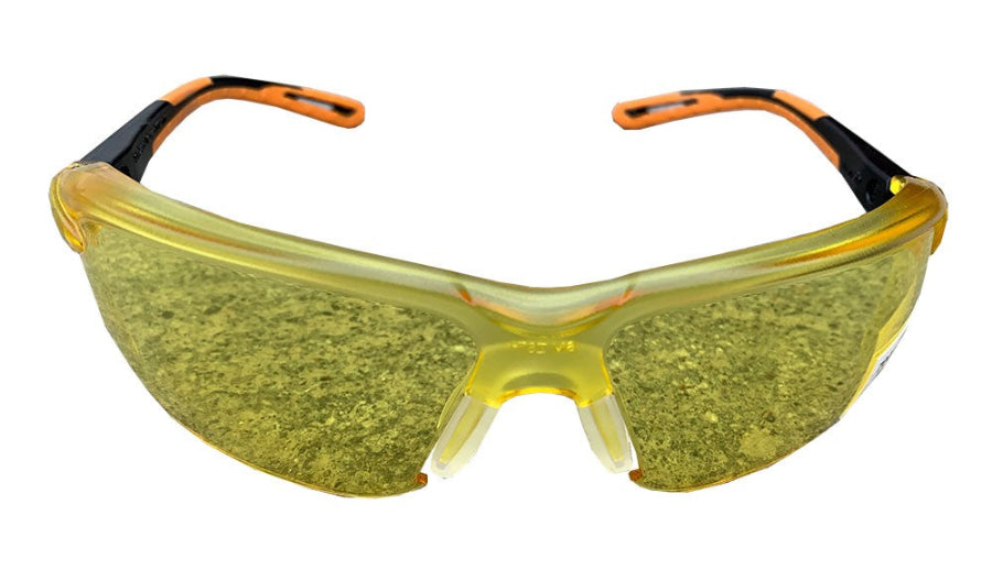 These safety glasses have anti-fog lens with black frames and amber lenses. They meet ANSI Z87.1-2010 and CSA Z94.3 standards. The ultralight frame design is made of 100% polycarbonate in sporty and sleek unisex styling. The high-impact lens blocks 99% of UV rays, and curves for excellent "wrap" front/side coverage.